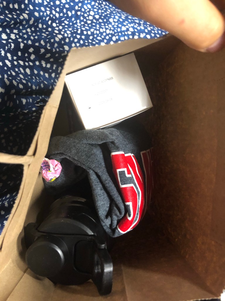 Eine Tüte mit Trinkflasche, T-shirt und Coronavirus Tests😂