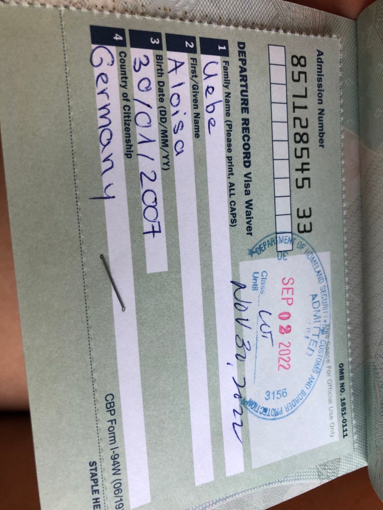 Der Grenzbeamte hat uns wie eigentlich schon erwartet ein wenig schräg angeschaut und hat uns dann nachdem er die Pässe angescannt hat, nett darauf hingewiesen, das Auto an der Seite abzustellen und uns im Büro zu melden. Naja, dort hat uns auf jeden Fall eine Frau erwartet, die erstmal ziemlich kritisch auf uns eingeredet hat, wieso wir kein Besuchervisa für mich beantragt hatten. Ich war total überfordert, was die von mir wollte🤯🥵. Als mein Gastvater dann aber immer weiter mit ihr ins Gespräch kam, wurde sie immer lockerer und netter. Im Endeffekt musste ich nur ein Formular mit meinen Kontaktdaten ausfüllen und es wurden Fingerabdrücke genommen und ein Foto gemacht. Danach musste mein Gastvater nur noch 6 Dollar bezahlen und dann habe ich auch schon meine Stempel in meinen Pass bekommen👍. Als wir schon fast durch die Tür waren, erinnerte uns die Frau dann nochmal dringlich daran, dass ich ab Oktober ein Besuchervisa brauche und dass ich sonst nicjz so einfach mehr in die USA komme. Und dann war ich auf einmal in den USA😂🥳!