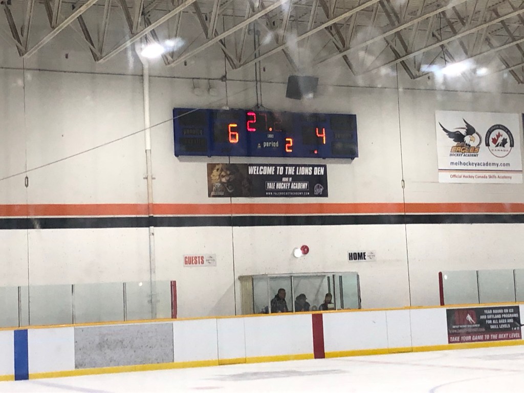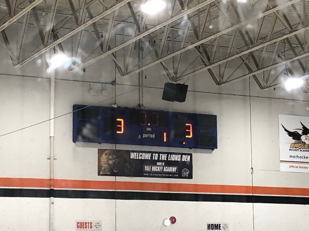 Als wir angekommen sind , war gerade ein Spiel am Ende. Das nächste Spiel haben wir dann ganz geschaut. Es gab zwei Periods mit jeweils 20 Minuten Dauer. Nach der ersten Period stand es so.