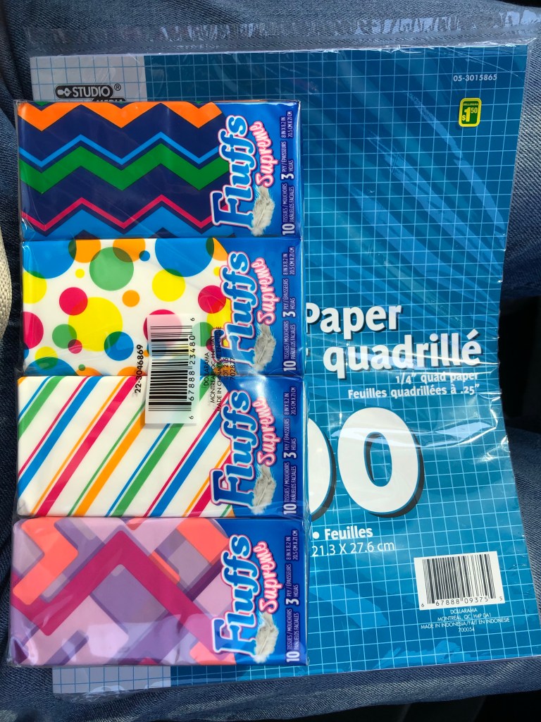 Und ich habe mir einen Block und past Taschentücher gekauft.