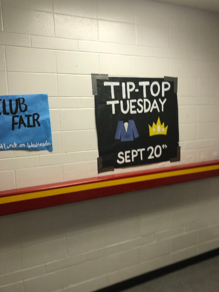 Danach hatte ich dann Mathe. War ganz cool, weil ich mit mehren Mädchen reden konnte und ich wurde gefragt, ob ich mit ihnen zusammen arbeiten möchte. Dann hatten die heute ein Quiz und eigentlich sollte ich ja nicht mitschreiben, aber habe ich dann doch. Witzig erweise konnten wir es zu zweit machen, sodass ich dann noch mehr reden konnte. Danach hat mir das eine Mädchen noch geholfen ein paar Aufgaben zu lösen, die ich zuvor noch nicht gemacht habe🥳. Danach war Schule dann vorbei. Auf dem Weg auf der Schule habe ich dann das im Gang gefunden. Es geht dabei um eine Art Motto Woche. Am Di geht es darum sich ganz Schick anzuziehen und am Mittwoch geht es um Highschool Stereotypes und so weiter…
