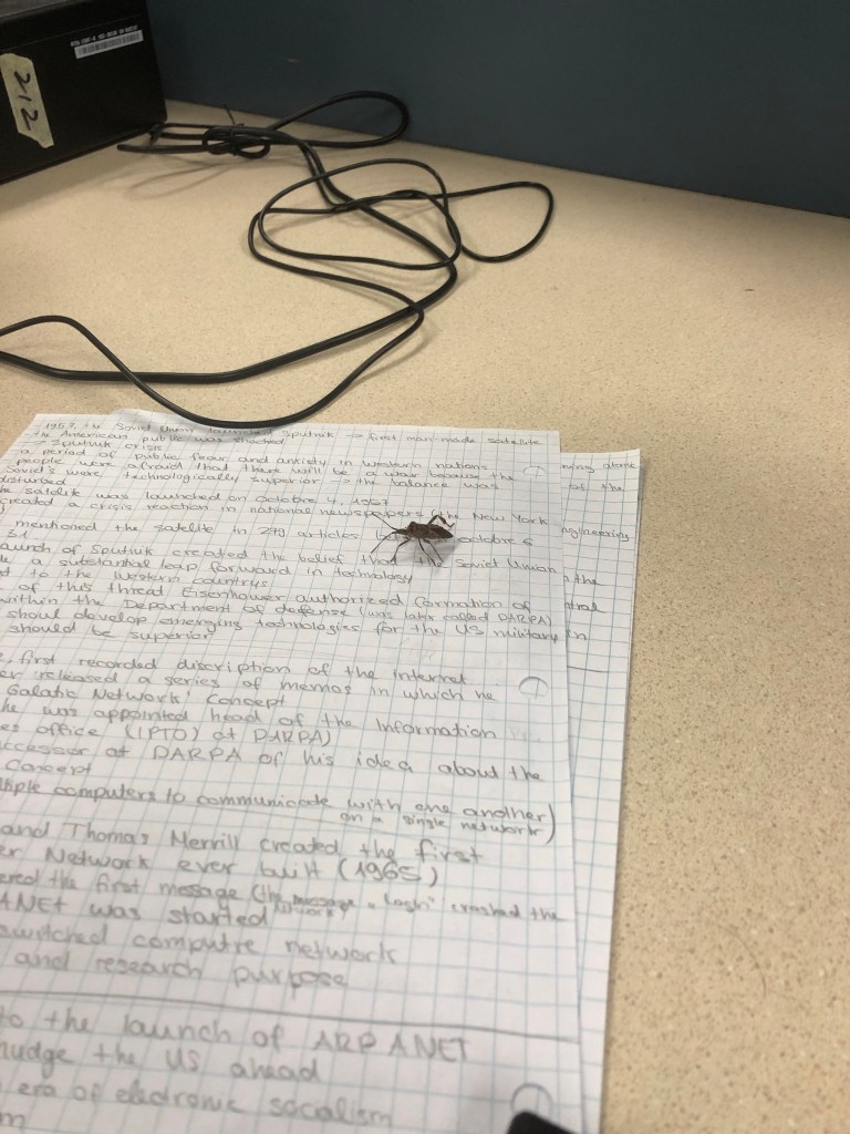 Meine erste Stunde heute morgen war Computer Programming. Die Lehrerin war nicht da, weswegen wir nur einen Arbeitsauftrag hatte. Das einzig wirklich interessante in der Stunde war, dass sich auf Einmak auch eine Wanze an unserem Abrebeitsauftrag beteiligen wollte😅.
