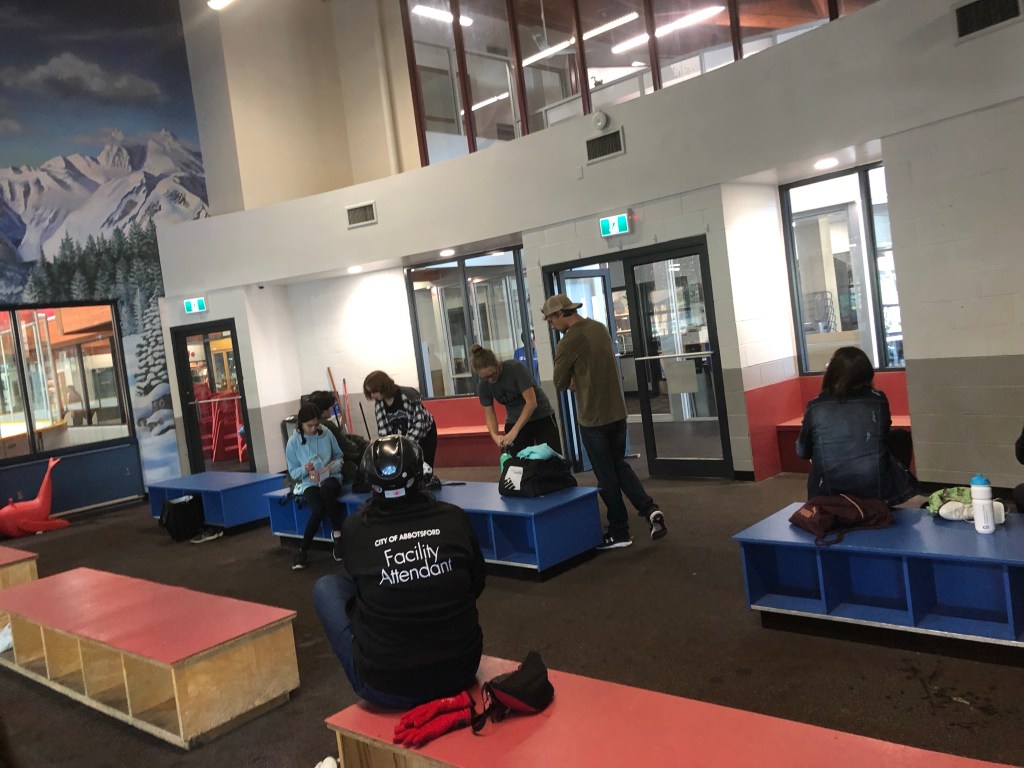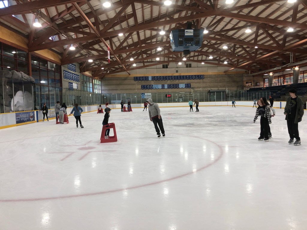 Als ich zu Hause war, bin ich dann erstmal duschen gegangen und habe dann meine Wäsche gemacht. Danach hat mich meine Gastmutter zu einer Bushaltestelle gefahren, wo ich mich dann mit zwei Internationals getroffen! Wir wollten zusammen Schlittschuh fahren😅. Naja auf jeden Fall sind wir dann in den Bus eingestiegen und haben erst mal so 5 andere Internationals getroffen, war sehr witzig😂! Als wir im Bus waren ist uns dann nach einer halben Stunde aufgefallen, dass wir einmal im Kreis gefahren sind. Waren auf der falschen Straße eingestiegen🙄🫣! Naja…nach einer weiteren halben Stunde sind wir dann endlich im Abbotsford Recreation Center angekommen🥳! Doof war nur dass wir erst um 14 Uhr ankamen und die Eishalle schon um 14:45 wieder schließt😩! Naja aber erstmal hieß es reingehen!