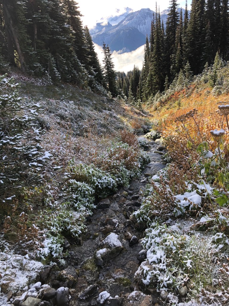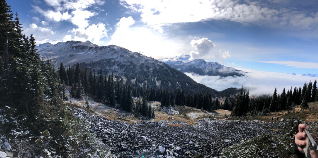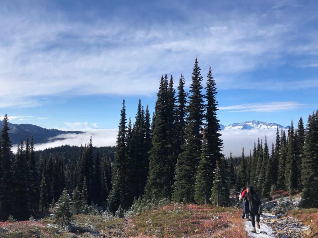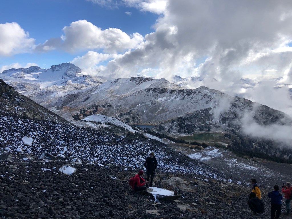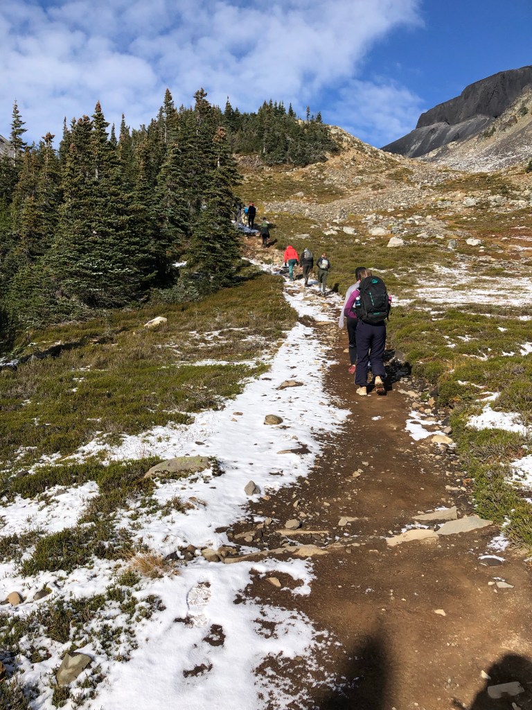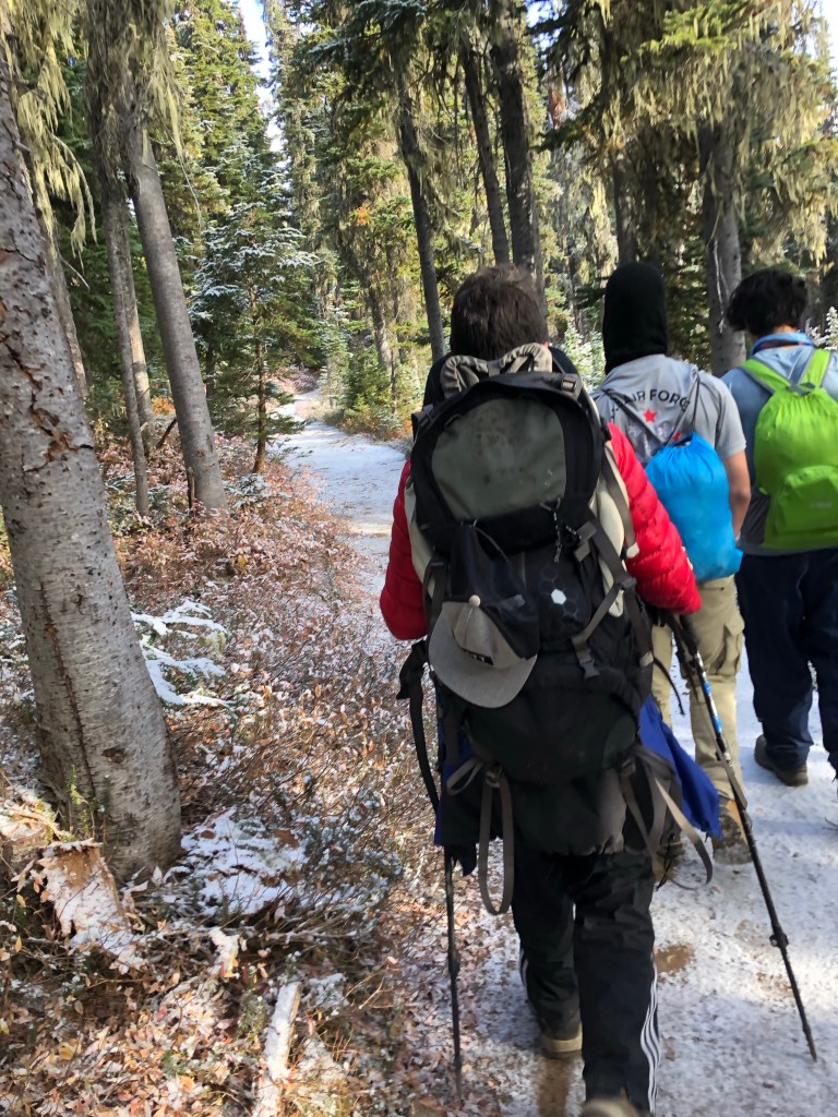 Mein Tag began heute kurz nach sieben. Man hat langsam gehört wie immer mehr Leute aufgestanden sind und gegen 8 haben wir uns dann auch motiviert aufzustehen. In kompletter Skibekleidung sind wir dann zum Frühstück gedackelt. Es war wirklich wieder echt kalt. Zum Frühstück gab es für uns Bagels mit Erdnussbutter und Käse. Fürs nächste mal sollten wir aber auch Poridge mitbringen. Einfach nur als dem Grund, dass das auch nochmal ein warmes Gericht ist. Nach dem frühstücken haben wir dann unsere Rucksäcke neu gepackt. Für die heutige Wanderung konnten wir unser Zelte und so da lassen und mussten so nur essen, trinken und warme Kleidung mitnehmen. Heute waren auch wieder circa 10 km angesagt und auch um die 1000 Höhenmeter. Außerdem mussten wir durch ein Gebiet wandern, wo es eigentlich einen weiteren Zeltplatz gibt, der aber geschlossen ist, da gerade im Moment eine zu hohe Grizzlies Aktivität ist. Naja….wird schon hahah😬🫣.