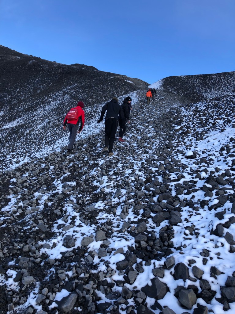 So zum Vergleich, der Aufstieg war teilweise ungefähr so wie unser Aufstieg auf die Zugspitze – der Geröll Part. Der einzige Unterschied bestand darin, dass dort auch viel Samd war, sodass die Steine nicht runtergerutscht sind. Das war ganz gut.