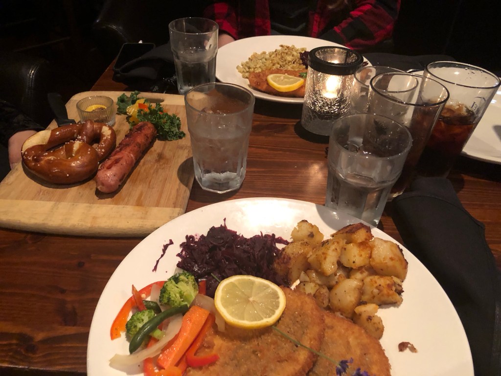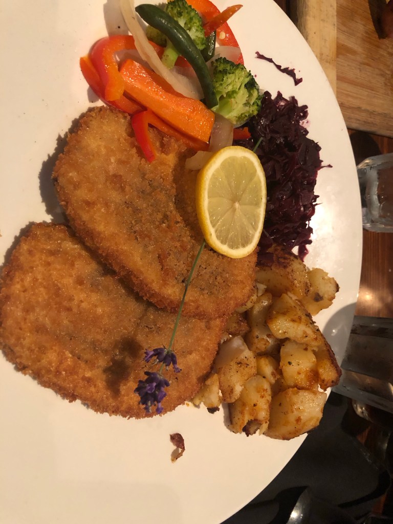 Ich habe mir dann ein vegetarisches Schnitzel bestellt. Das Schnitzel war jetzt nicjz so der Börner, aber die Kartoffeln und der Rotkohl war seeeeehr lecker. Die anderen haben gesagt, dass ihr essen seeeehr gut war und dass es auch erstaunlicherweise sehr deutsch schmeckt!